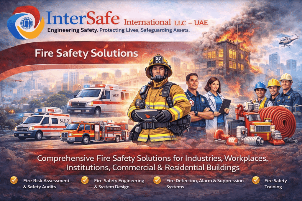 InterSafe International LLC – UAE delivers end-to-end Fire Safety Solutions aligned with international best practices and applicable national fire codes. Our expertise spans risk assessment, system design, equipment supply, implementation, training, and lifecycle management for industrial, commercial, institutional, and residential environments. We focus on prevention, preparedness, early detection, rapid response, and safe evacuation—ensuring people, property, and operations remain protected.